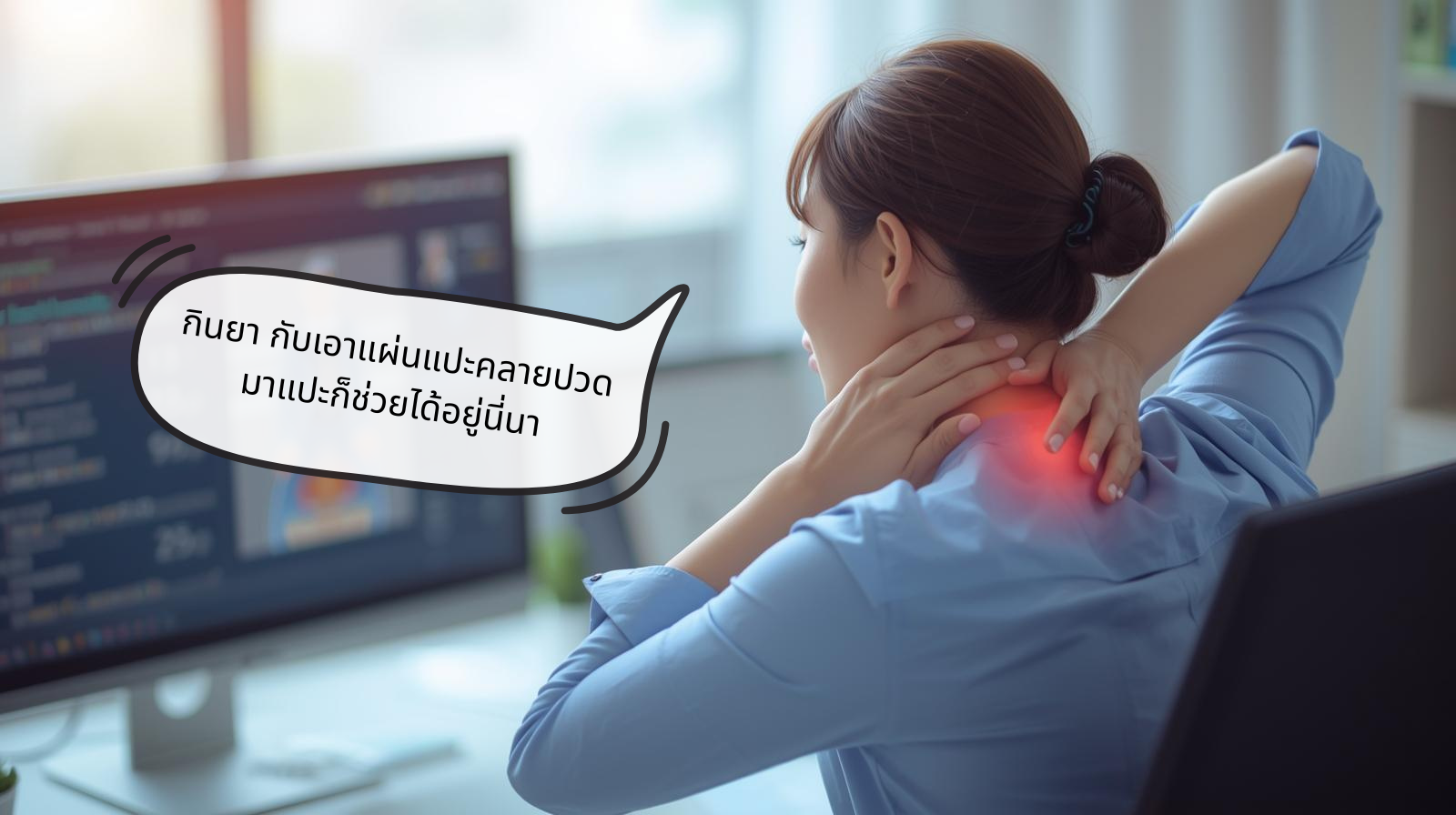เรื่องราวของเราอาจจะคล้ายกับชาวออฟฟิศหลายๆคน เราเป็นคนนึงที่มักจะมีอาการปวด คอ บ่าไหล่ แวะเวียนเข้ามาทักทายเป็นประจำหลังจากที่ต้องนั่งจ้องหน้าจอคอมพิวเตอร์เป็นเวลานานๆ หลายชั่วโมงติดต่อกัน ช่วงแรกเราก็บรรเทาอาการปวดด้วยการไปนวดคลายเส้นบ้าง เอาแผ่นแปะคลายกล้ามเนื้อมาแปะซะแทบจะทั่วตัว หนักเข้านานวันก็กินยาแก้ปวดหวังพึ่งให้มันหาย คิดไปเองว่า "มันก็เป็นแค่อาการปวดกล้ามเนื้อธรรมดาทั่วไป กินยาเดี๊ยวก็หายแล้ว ไม่ต้องไปหาหมอให้เสียเวลา"